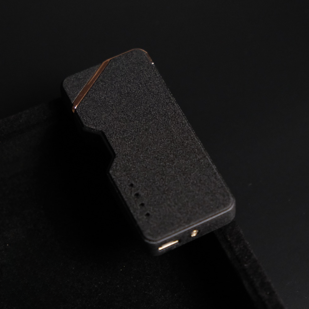 A sleek lighter with a modern frame. Rechargable design, adjustable flame, and easy to ignite with a gentle flick of the wrist.